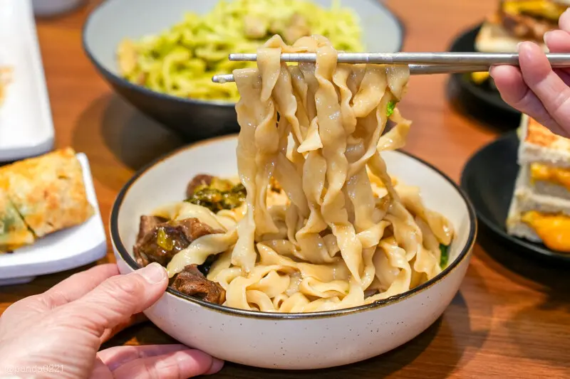 牛肉乾拌麵的寬麵Q彈有勁,份量十足,特製醬汁清爽不死鹹,牛肉大塊又有嚼勁,吃了讓人滿足!