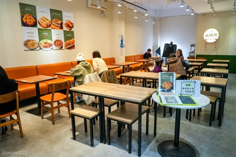 福飽飽的用餐環境寬敞,主要以2-4人桌為主,約可容納55人。店內綠橘色的設計,營造出活潑自然的氛圍。