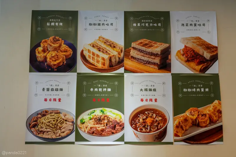 推薦必吃的有鬆擱有辣、椒椒豬肉吐司、榛果巧克力吐司、泡菜肉蛋吐司、青醬菇雞麵、牛肉乾拌麵、大腸麵線以及椒椒烤肉蛋餅。