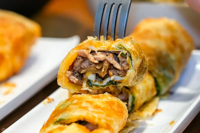 塔香炒肉蛋餅,每一口都能品味到九層塔的香氣和鹹香多汁的炒肉,口中餘香不散。