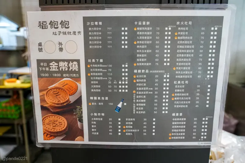 福飽飽的菜單有炭火吐司、卡茲蛋餅、福堡堡、社長下麵、小點炸物、福飽飲品和韓國氣泡酒,平日下午茶13:30-16:30還提供金幣燒(起司/巧克力)喔!無論中式或西式,多元化的品項,所有餐點皆為現點現做。