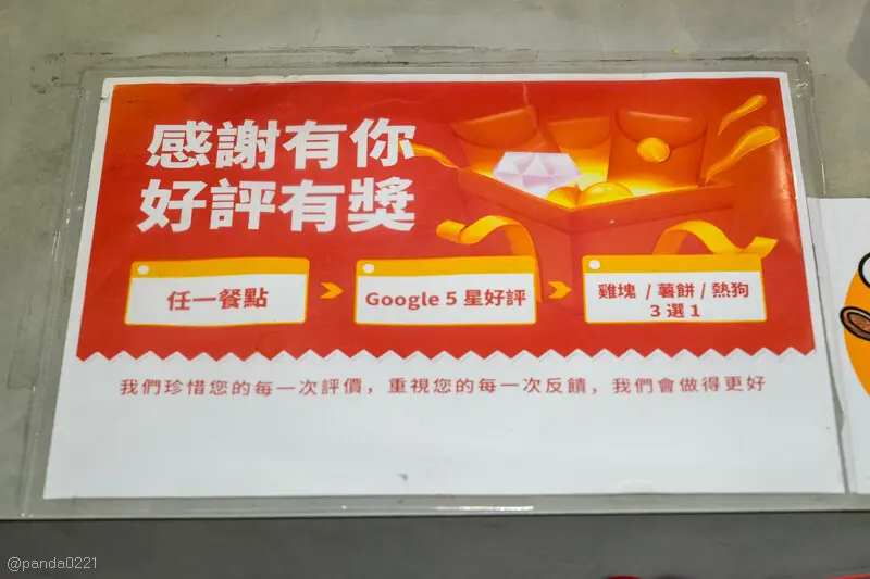 福飽飽點任一餐點並給予Google 5星好評,可享雞塊、薯餅、熱狗三選一。
