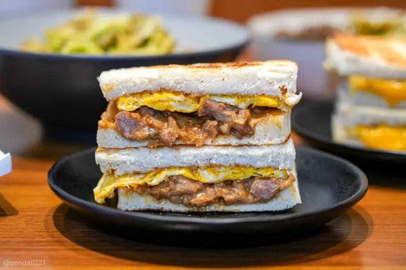 花醬肉蛋吐司一上桌,濃濃的花生香氣撲鼻而來,搭配鹹香炒肉和厚實柔嫩的歐姆蛋,口感蓬鬆順滑,鹹甜的滋味與花生醬完美融合!