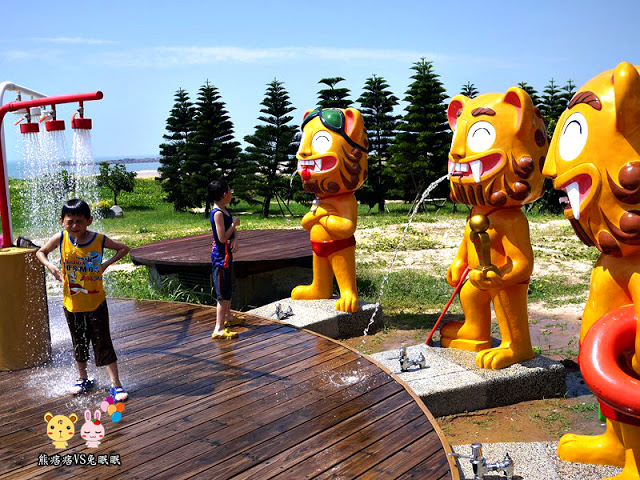 眼前逗趣造型的風獅爺,穿著泳褲、帶著救生圈,開口笑的迎接著即將下水的遊客們。