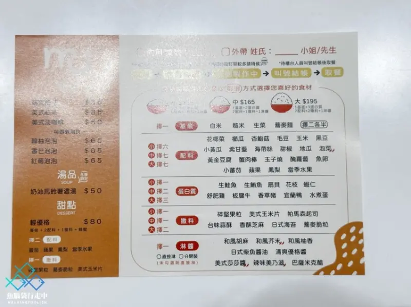 菜單依據小碗、中碗、大碗,進行選擇基底、蛋白質、配料、撒料、淋醬等,菜單整理如下供大家參考。