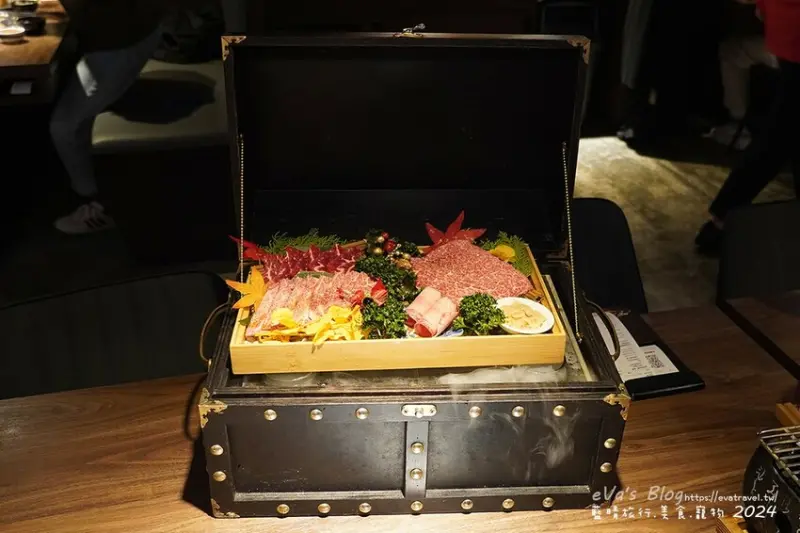 【台中燒肉】山鯨本家.HONKE,跨年就是要吃好料的呀,免出國讓人彷彿置身於日本,浮誇的和牛寶箱一登場相當的吸睛,打開寶箱之後乾冰流出來,這畫面還自帶著仙氣!吃燒肉也可以擁有滿滿的儀式感喔!。台中燒烤
