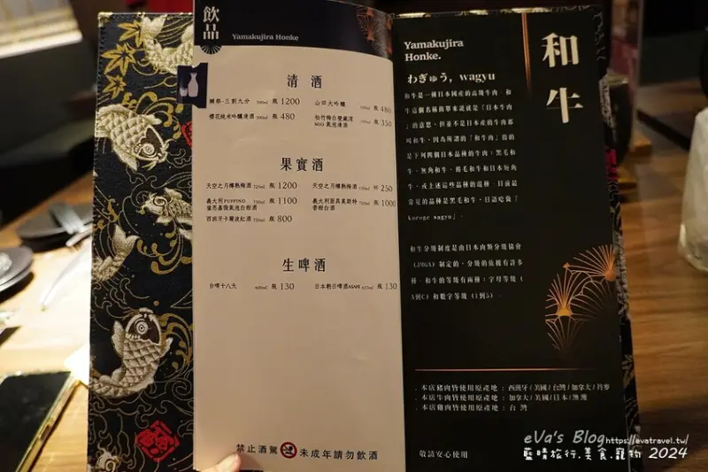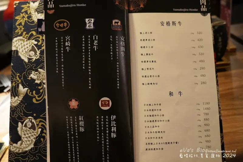 提供單點菜單,有安格斯牛、和牛、牛舌、海鮮、漬物、食事跟聯名創作等多道食材可以加點