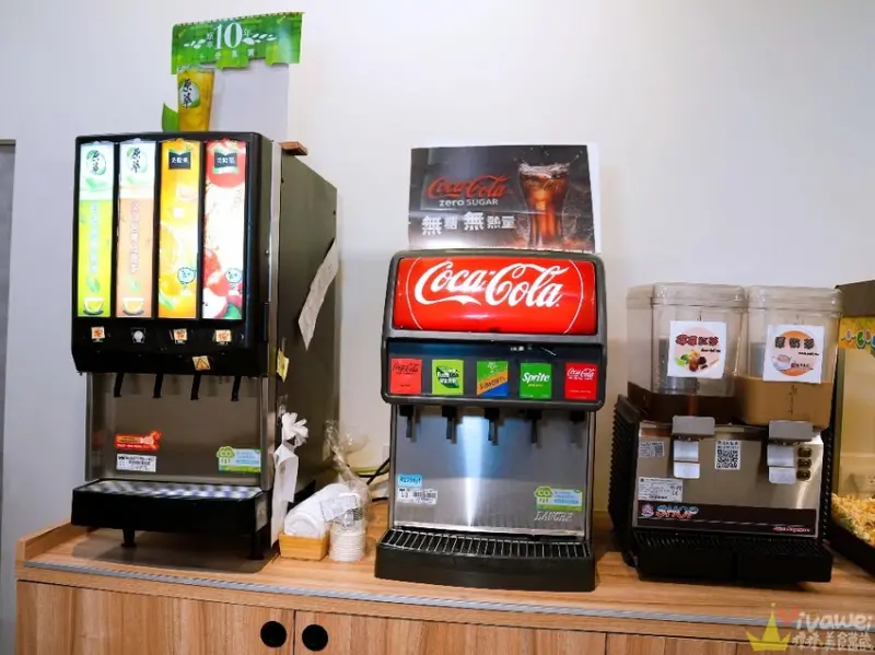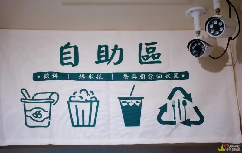 ▲往店家的後方走有自助區,提供飲料、爆米花、餐具廚餘回收區!