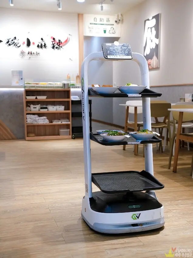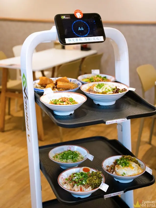 ▲餐點準備好以後,店家會用機器人送到桌邊,送到桌邊後需要自行把餐點取下,取完餐後再點平板上面的完成鍵就OK囉!
