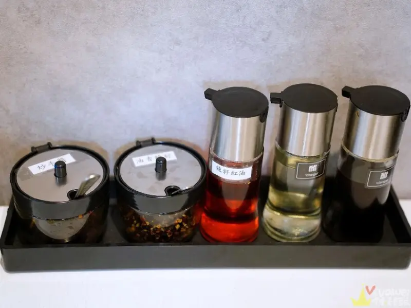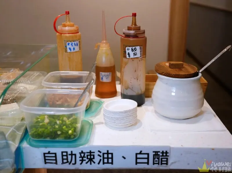 ▲櫃檯前方的自助區提供蔥花、酸菜、辣油、白醋等醬料,都可以依照個人口味自行取用!