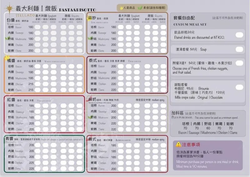 星空Stellato的義式餐點有八種醬料可以選擇,配料有六種,又可以自由選擇要義大利麵還是燉飯,份量有普通、一般加、超級加三種選擇,價位180元到225元,可以說是超級平價版的義式餐廳啊,又可以客製化多種選擇的感覺。