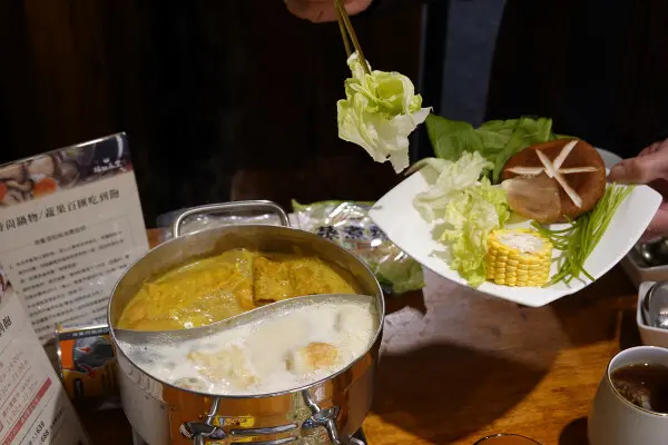 養生豆漿鍋放進各種蔬菜和豆腐,吸滿湯汁後,每一口都是豆香加鮮甜,超治癒的!南洋咖哩鍋加了菇類和玉米,咖哩湯底吸收了蔬菜的甜味,整鍋更升級!