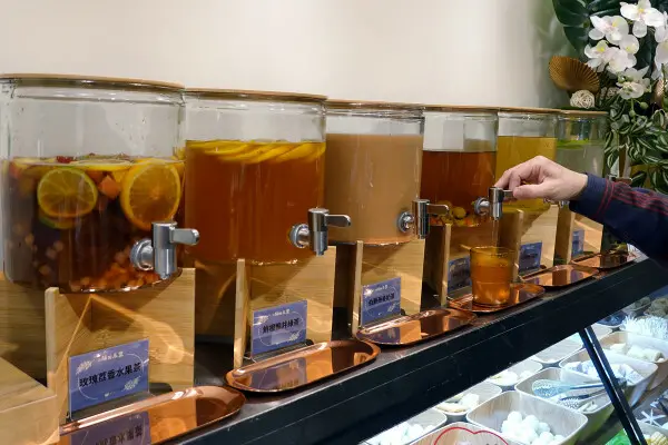 這裡的自助吧每天會供應六種不同的冷飲,每一款都超級好喝,讓人根本停不下來。當天共應的是水果茶、鮮橙綠茶、伯爵燕麥奶茶、冰糖菊花枸杞、梅子醋飲和香草檸檬薄荷水,每一口都清新又解渴,完全能搭配火鍋的味道!