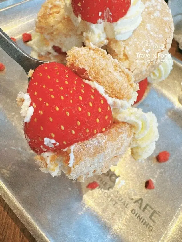 當日櫥窗櫃至少有十種甜點,算一算該是草莓季的時候到了,直接點了草莓浮霜塔來嚐嚐。不得不說,微酸的草莓非常適合做甜點,完全不會太甜膩,連平常不嗜甜點的明太子,二三口就清盤,直呼太好吃了!