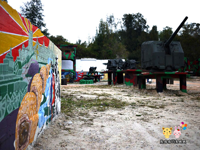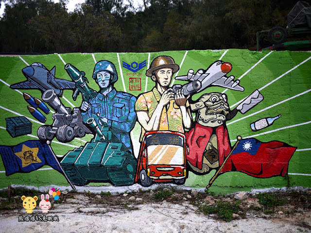 週遭的牆壁上,有許多軍事化的塗鴉,右邊風獅爺拿菜刀的模樣是哪招啊?