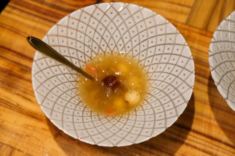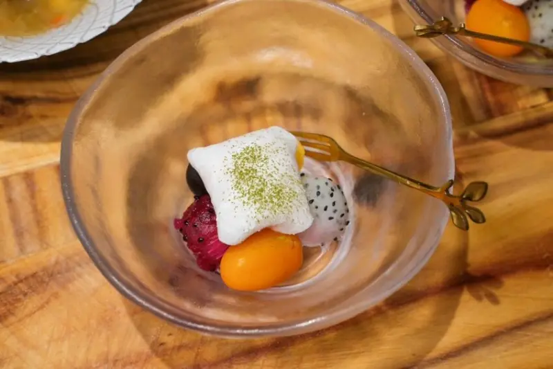 ▼最後的甜點以甜湯、水果皿收尾,養生的甜湯冰糖銀耳蓮子湯,入口滑順充滿濃稠感,配上香甜當季水果+冰淇淋剛剛好!