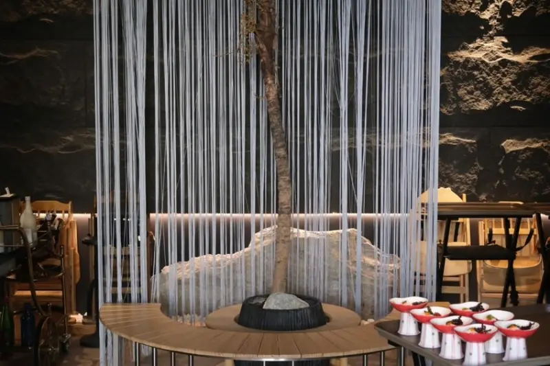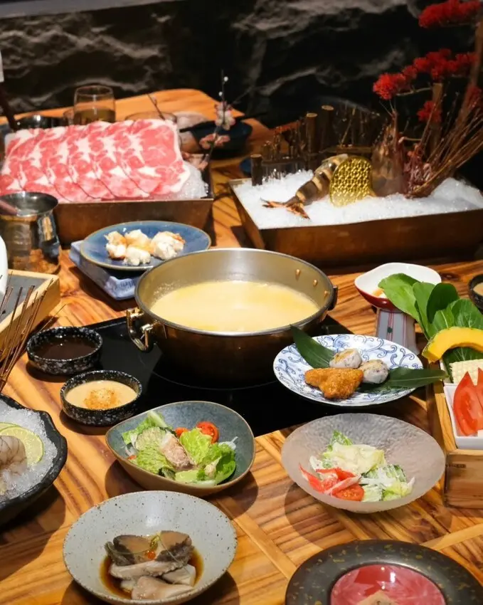 ▼【天塩川和室鍋物】用餐環境宛如私人豪宅奢華,挑高的木造設計與岩石牆面,整體非常氣派又有質感,座位以四人桌為主,也有半開方式的圓桌包廂,很適合團體或是家族聚餐。