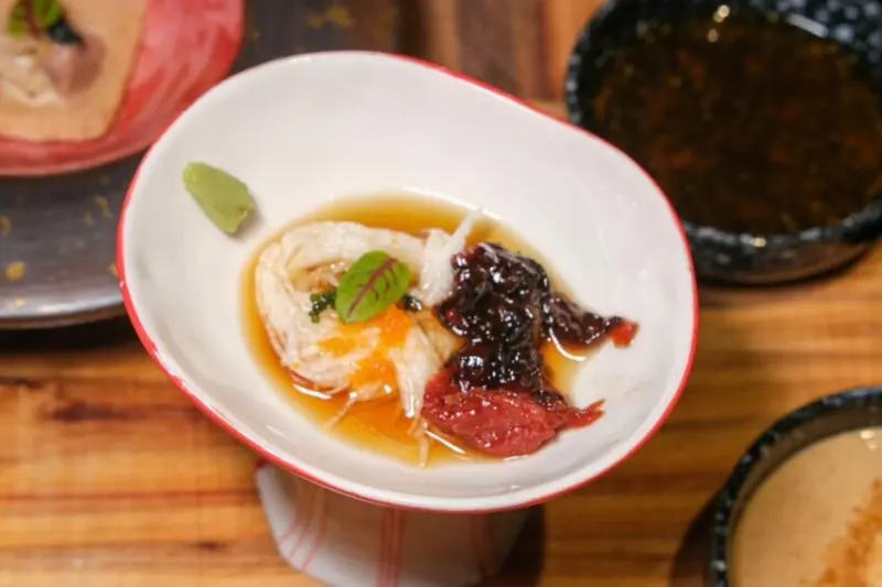 ▼以日式料理手法呈現的魚子醬鱈魚肝蝦餅,咬下去酥脆又卡滋,鮮味瞬間撲鼻而來;蜜冷麵把蜜番茄、蜜洛神花拌入冷麵,酸酸甜甜的滋味好討喜!