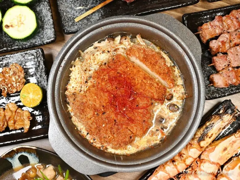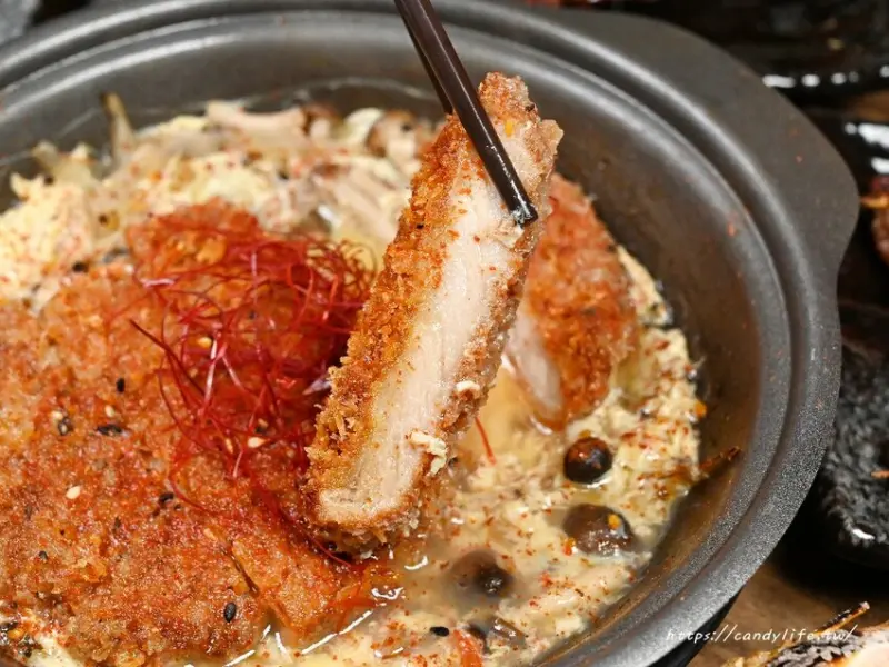 通常在日式炸豬排店才吃得到的豬排煮,在魚小二串燒酒場也吃得到,採用台灣溫體豬里肌肉,裹粉之後炸至金黃色澤,再放入滑蛋、鴻喜菇燉煮的高湯,讓酥脆紮實的炸豬排多了滑蛋的滑嫩及湯頭的鮮甜