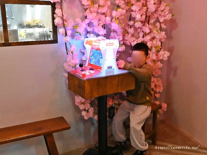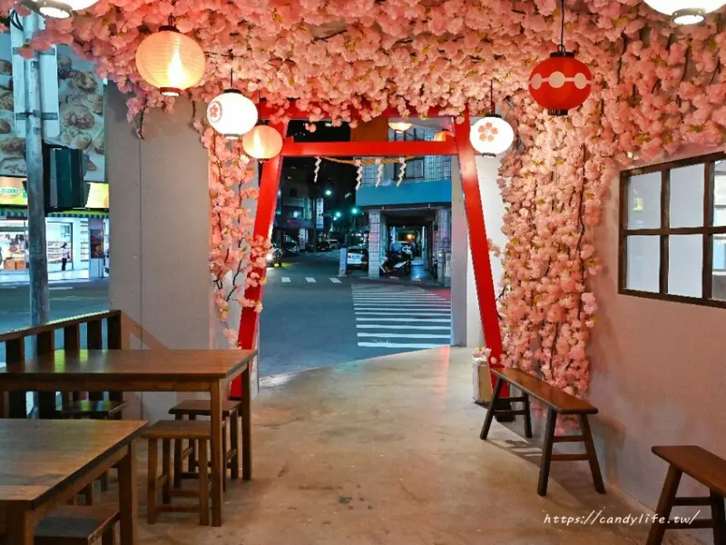 魚小二串燒酒場台中昌平旗艦店裝潢帶有濃濃的日式風格,門口處布滿了美美的櫻花,晚上拍起來也很美,旁邊還有個可愛的遊戲機可以免費使用