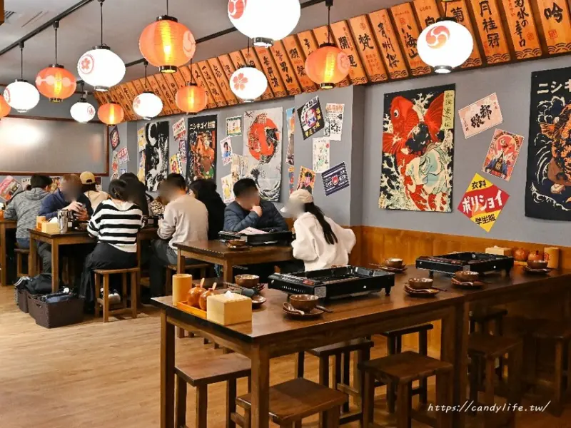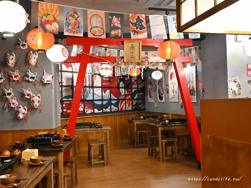 魚小二串燒酒場台中昌平旗艦店分一二樓,主要座位區在二樓,空間寬敞舒適,裝潢充滿濃厚日式風格,每個角落都好好拍,彷彿置身於日本居酒屋