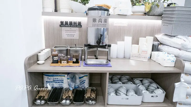 餐具自取區就在一旁,想要辣椒醬、蔥油醬或酸辣醬都能自取,還有免費的雞湯可以喝,旁邊還擺著一整堆泰國香米。