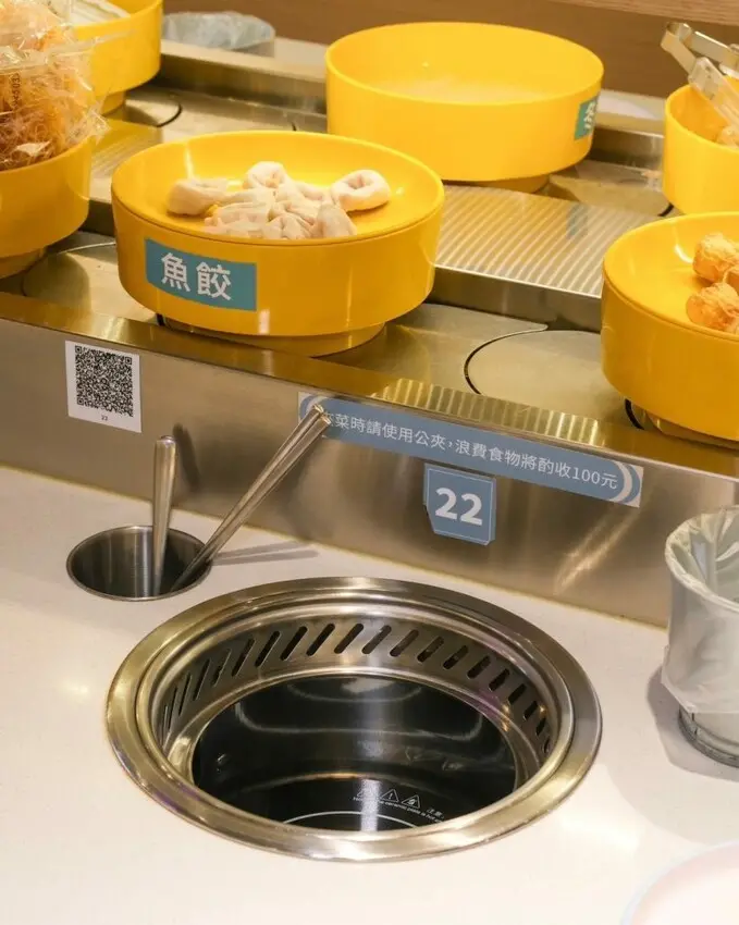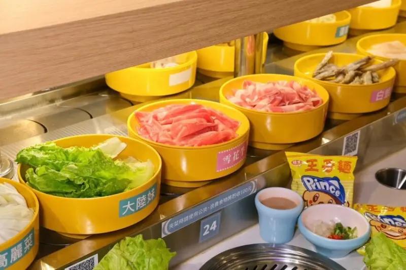 ▼【嗨咿迴轉火鍋】採以ㄇ字型迴轉火鍋的用餐方式,用餐時間90分鐘不收服務費,入座後可使用公用夾子開始夾取你要的餐點,包含肉品、海鮮、蔬菜等,總共多達128款品項吃到飽。