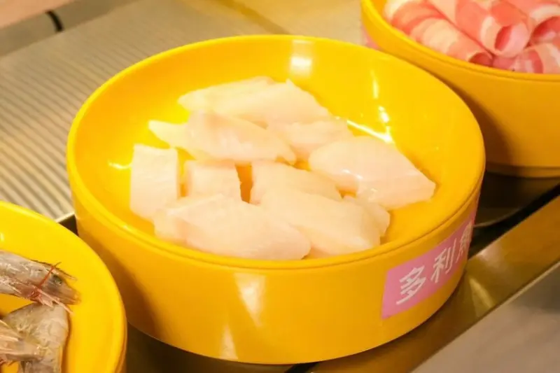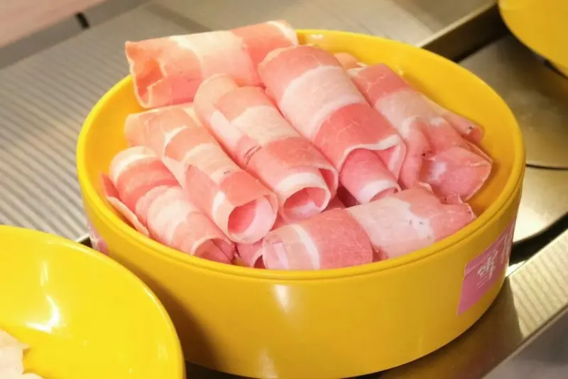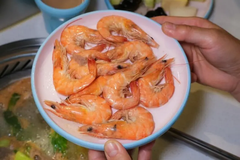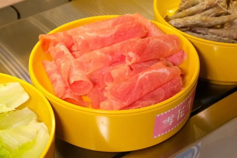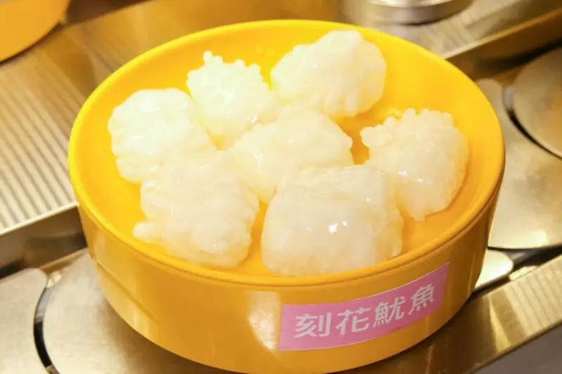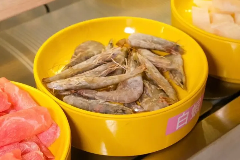 ▼【嗨咿迴轉火鍋】食材有牛豬雞肉可夾取,每一片都很完整大塊新鮮;還有軟嫩的巴沙魚和彈牙花枝,▼以及完整鮮美的白蝦可享用,多吃個幾盤就可以回本啦!