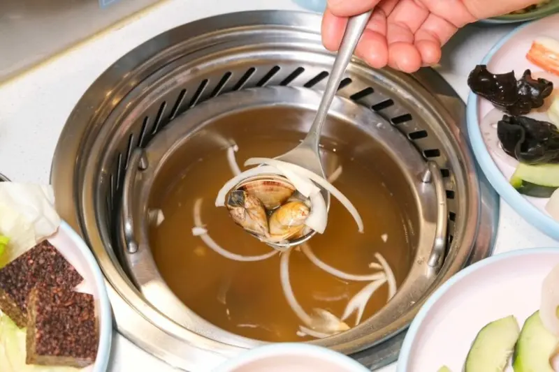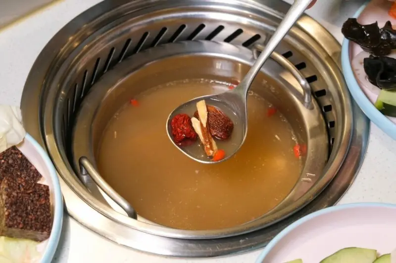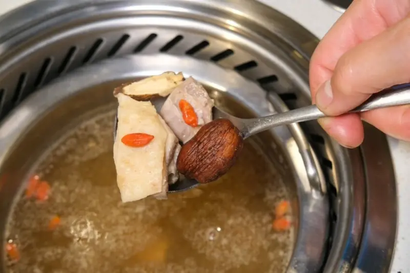 ▼【嗨咿迴轉火鍋】有免費的原味高湯,還有香純牛奶、剝皮辣椒、卜卜蛤蜊等八款加價湯底可選擇;大推養生麻油藥膳和卜卜蛤蜊兩款湯頭,湯底本身就能吃到食材,湯頭溫潤順口,拿來涮肉或涮菜都很適合。