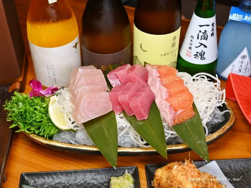 綜合生魚片裡頭包含了鮭魚、鮪魚及旗魚三種魚肉,每片生魚片都超厚切,魚肉都很新鮮,糖糖最愛鮭魚生魚片,含豐富油脂,肉質軟嫩,入口即化,鮮味十足呀