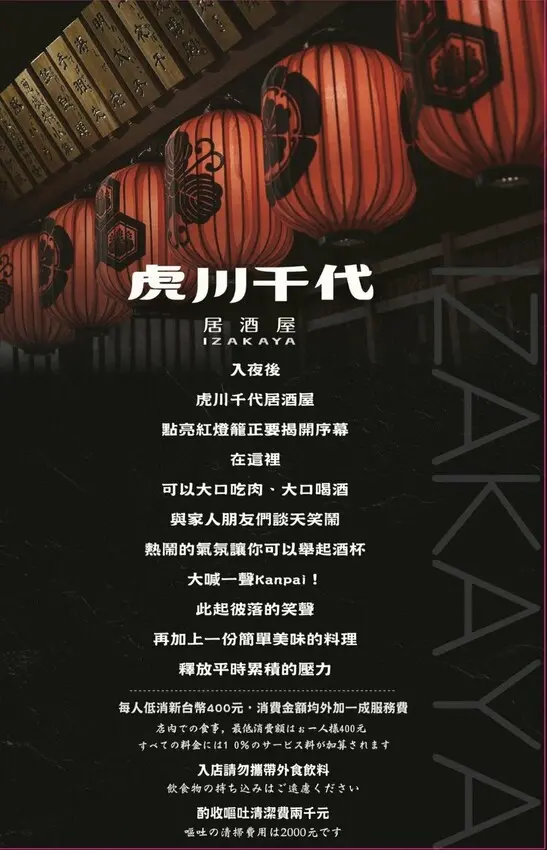虎川千代居酒屋健行學士店不只外觀,店裡頭的裝潢也充滿濃厚復古日式風格,內用座位區寬敞舒適,二樓還有提供包廂座位,非常適合多人聚餐