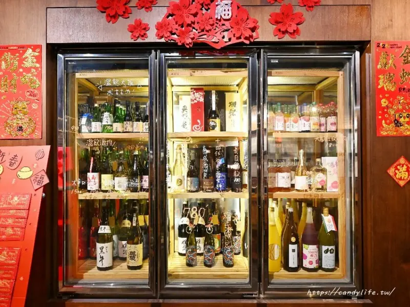 虎川千代居酒屋健行學士店門口前方設置了一個清酒櫃,裡頭擺放了各式各樣的清酒及日本飲料