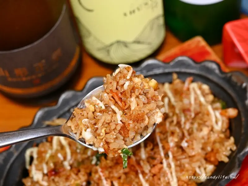 加入滿滿櫻花蝦、鮭魚、雞蛋及白米下去大火爆炒,上頭擠上日式美乃滋,一上桌就聞到迷人香氣,米飯Q彈,口感粒粒分明,吃起來帶有鍋氣香,搭配日式美乃滋,多了微甜滋味,層次更加豐富