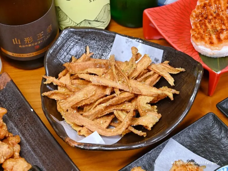 等待美味餐點上桌前,店家會先招待一份炸牛蒡,是說糖糖可是虎川千代居酒屋炸牛蒡的愛好者,將牛蒡切成片狀下去炸至金黃色澤,上頭再撒上些許糖粉及海苔粉增添香氣,口感香脆不油膩,吃起來還會發出卡滋卡滋的清脆聲響,微甜香氣讓人越吃越涮嘴