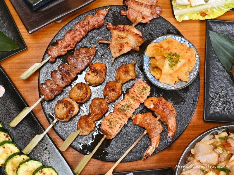 串燒類不知道該怎麼選擇,直接點這盤綜合烤肉盤就對了,裡頭包含七里香、雞心、海老豚、雞松板、扇貝、明太子雞腿肉及手羽先,中間搭配黃金泡菜可以搭配享用