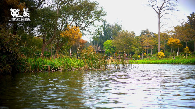 小橋。流水(冬天水位降低硬ㄠ=3=)。楊柳樹!這是杭州嗎?其實這是植物園的溼地生態與水生植物展示區,完整的保留許多動植物,具有生態教育之功能