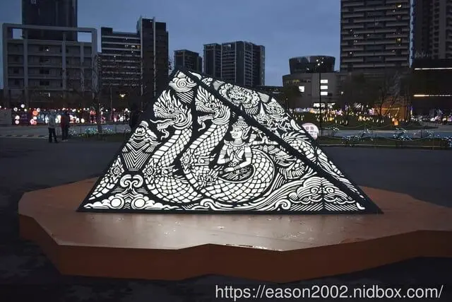 簡約的黑白色調,以葉子為造型基礎,象徵與台灣土地融合的養分,島嶼造型彷若挺拔的山峰,每一面皆以泰國神話傳說中的納迦和迦樓羅為主題,表達台灣這片土地如山般堅實,又能接納並包容來自四面八方的文化與族群。