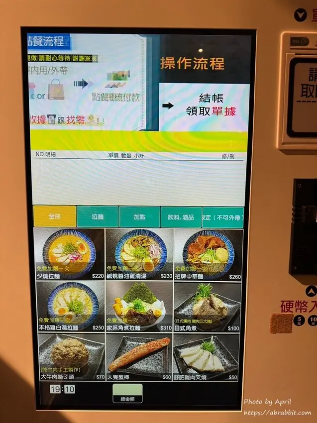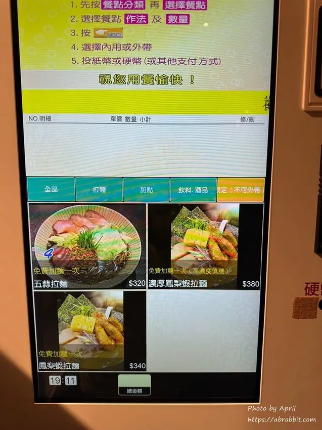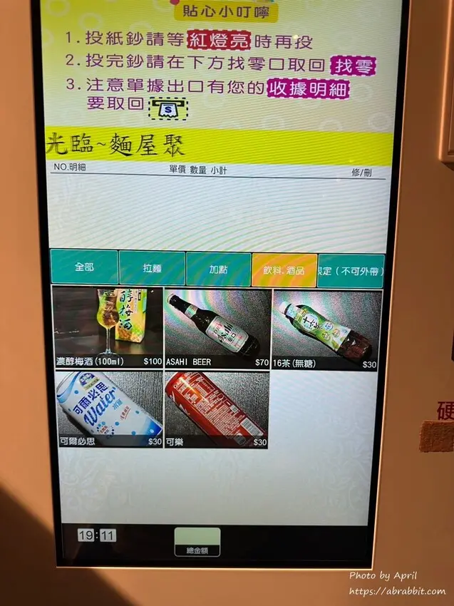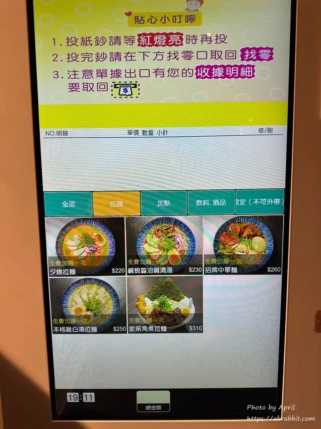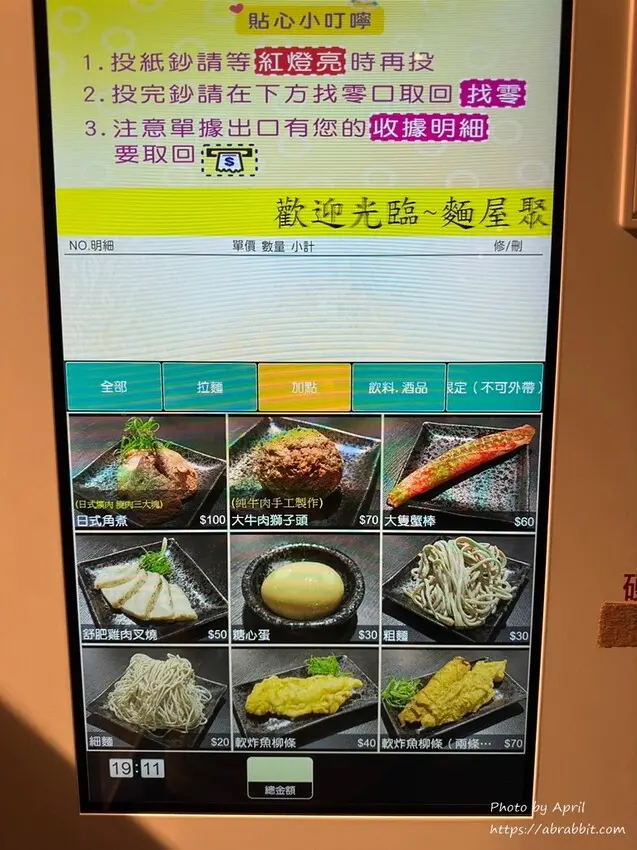 麵屋聚點餐機點餐方式很簡單,直接在點餐機選擇內用或外帶,點完餐直接用現金付款就好。而且他們家的拉麵竟然還可以免費加麵一次!