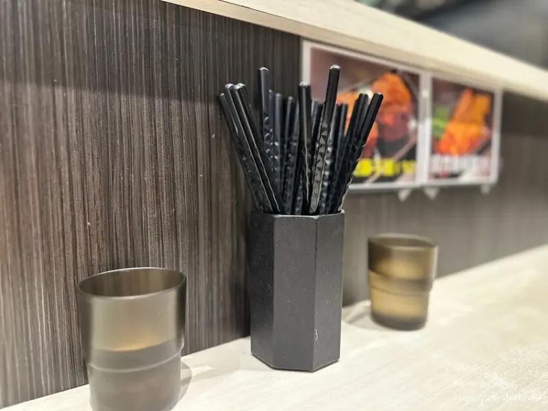 坐在吧台前面還可以邊看老闆煮拉麵,牆上也有一些拉麵的照片和加點的菜色可以參考。聽說店家還會不定時推出限定口味的拉麵,超級期待的! 一入座之後,店員就會送上水杯,桌上的筷子可以自己拿取。
