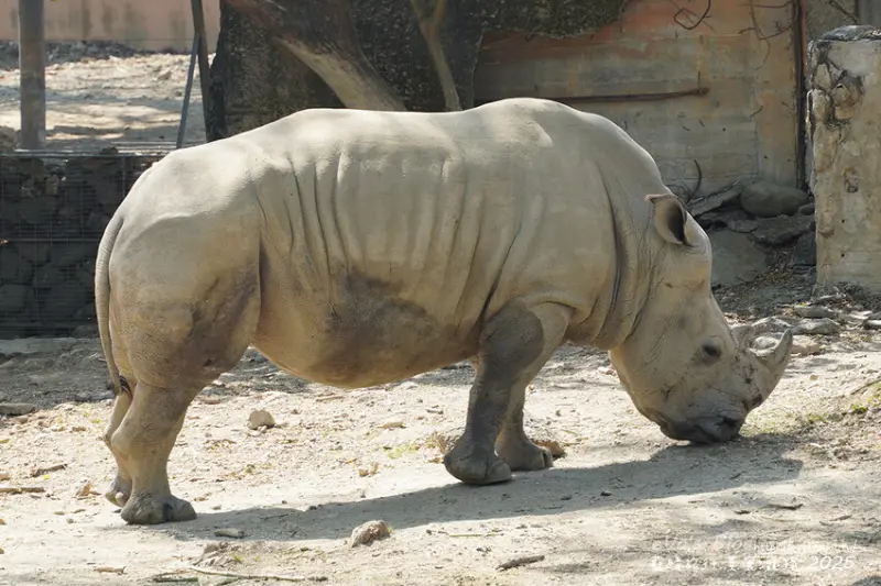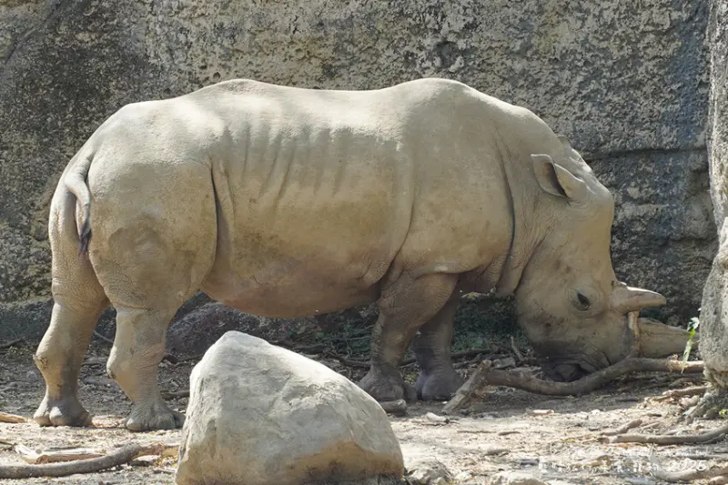 這兩隻白犀牛是一公一母,頭上角比較長的是女生(77年次)叫寶寶;頭上角比較短的是男生(102年次)叫犀奇,剛開始只有看到半顆犀牛頭在遠處的洞穴裡,繞一圈回來看到兩隻都出現了耶,體型蠻大隻的