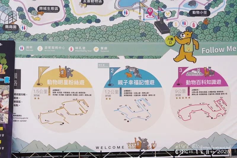 1.動物明星粉絲遊,路程約1.5公里,狐獴、老虎區、羊駝廊道、水豚山屋、猿猴家族、非洲象、非洲獅、兒童牧場、黑猩猩、白犀牛、黑熊山屋