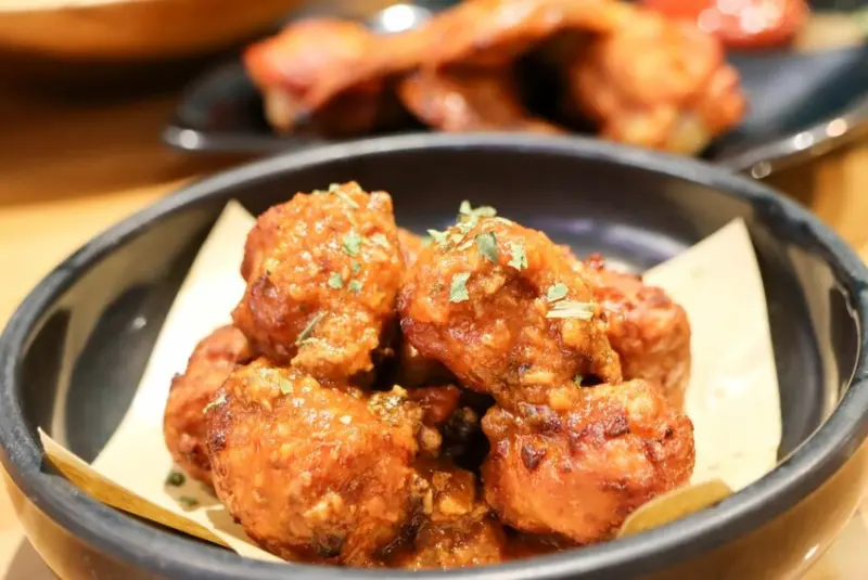 略帶紮實口感的雞肉丸,均勻地裹上肉醬,調味適中不膩口