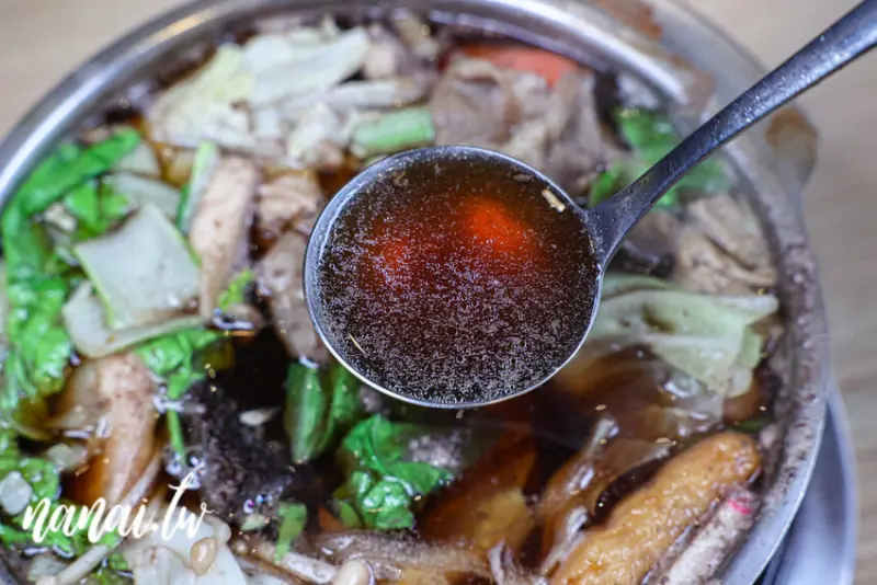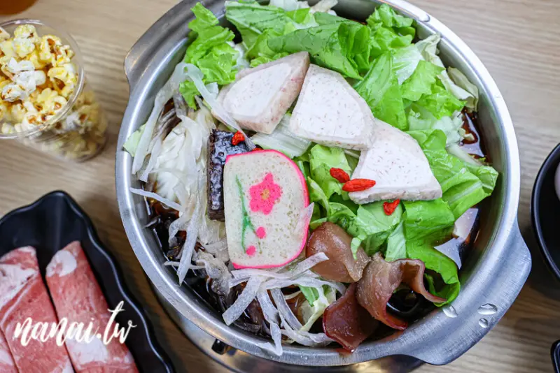 火鍋食材給得很澎湃,有高麗菜、綠色青菜、芋頭、木耳、金針菇、鑫鑫腸、寬冬粉…等多種火鍋料,基本上是可以吃得飽。