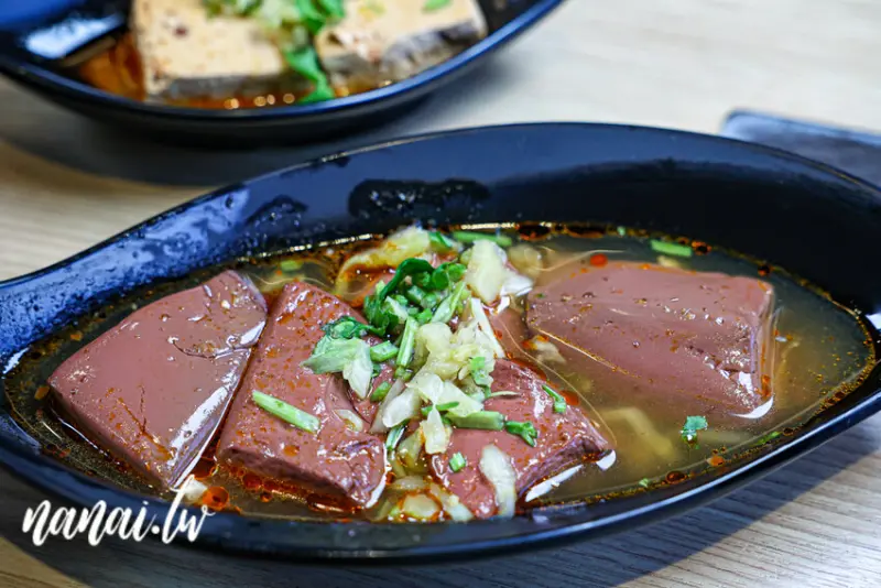 招牌滷鴨血共有5大塊,份量也算實在,口味屬於小辣程度,入口花椒辛辣香在口中蔓延,尾韻辣度不會停太久,鴨血滷得入味,熟度上也不會太老。
