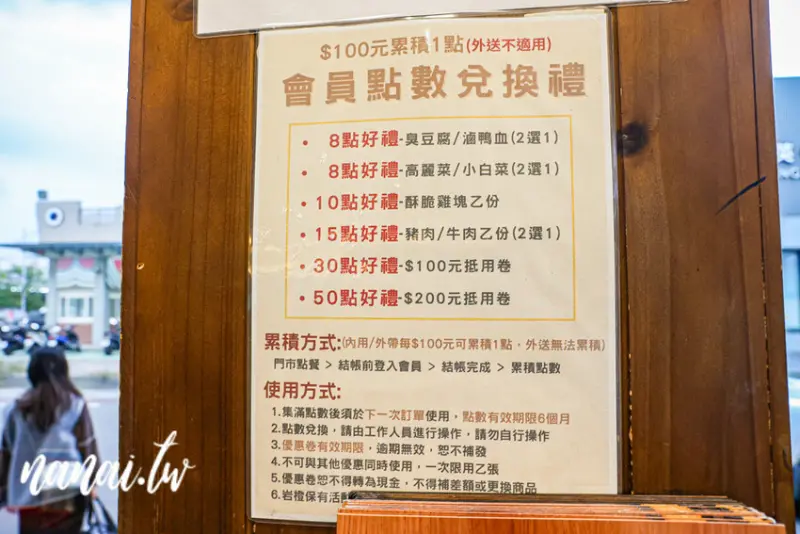 有會員點數兌換禮,只要消費100元可累積1點,集滿八點即可臭豆腐/滷鴨血2選1,集滿50點就送200元抵用卷,喜歡吃的朋友絕對要集好集滿。
