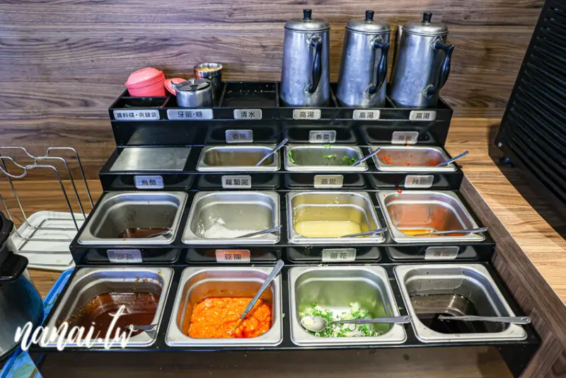 醬料選擇性豐富,現場多達十二種沾醬可使用,如需加湯採自助式取用。