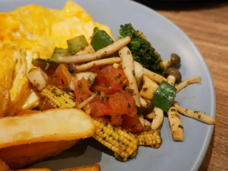 溫時蔬蠻豐富,有玉米筍、番茄、花椰菜、櫛瓜跟菇類,調味不會太重,