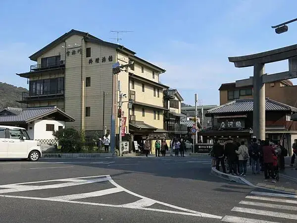 "宇治川旅館" 位於宇治老街入口,淡雅的鵝黃色房子,凸顯斗大的黑字招牌~