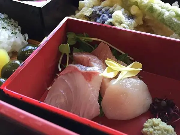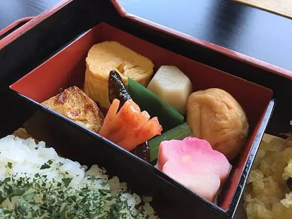 餐點內容_關東煮、天婦羅、海苔飯、抹茶小丸子、生魚片、涼拌豆腐、抹茶蕎麥麵、熱湯、醬油。