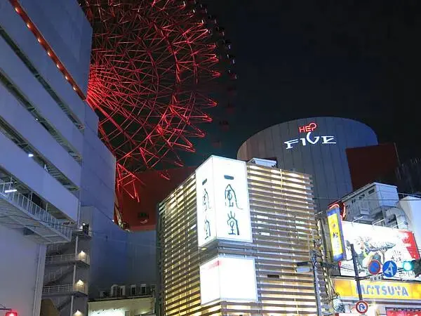 梅田Hep Five 摩天輪 在 梅田Hep Five百貨裡,搭乘地鐵到梅田站就會看到,是非常明顯的目標。
